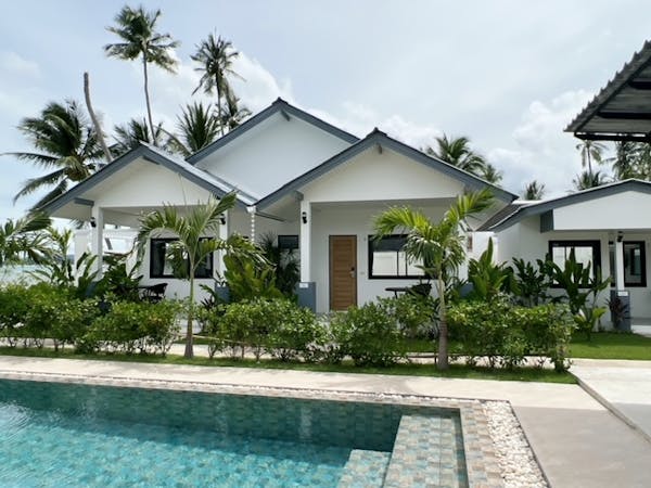 Our beautiful family sea view villa suite has a large main room with a king bed, sitting area and walkout to private balcony overlooking the Gulf of Thailand with exclusive sun beds and sitting area. The second bedroom has a queen bed and individually controlled AC unit. Large en-suite containing a rain shower, double vanity and bathtub.